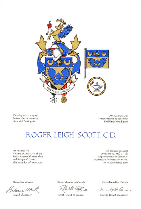 Insigne de Roger Leigh ScottBlasonUne lampe d'argent allumée de gueules enclose dans un anneau de corde d'or; SymbolismeLa corde désigne la nomination de M. Scott comme aide de camp du lieutenant-gouverneur de l’Alberta en 2000. Elle évoque, en particulier, les aiguillettes que portent les ADC à l’épaule droite. La lampe antique fait allusion à sa profession d’infirmier autorisé. La corde combinée à un symbole médical reprend le symbolisme des armes. Les couleurs de la lampe représentent à nouveau son dévouement envers le Canada, et sa flamme relie la lampe au flambeau du cimier. Il a été le premier officier cadre instructeur de cadets à être nommé ADC et le seul officier infirmier de la Branche des services de santé à détenir ce poste. |