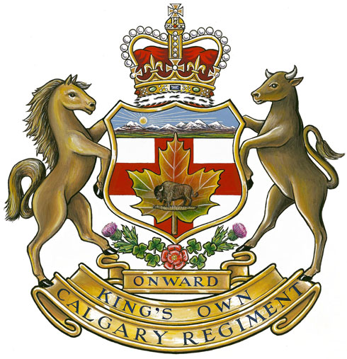 Insigne de The King's Own Calgary Regiment (RCAC)BlasonUn écu d’argent à la croix de gueules, à la feuille d’érable dans ses teintes automnales brochante chargée d’un bison arrêté sur une terrasse, au chef chargé du paysage local au soleil couchant, le tout au naturel, l’écu sommé de la couronne royale du même, supporté à dextre par un cheval et à senestre par un bœuf, soutenu d’une rose accompagnée de trèfles et de chardons le tout au naturel, et de trois listels d’or l’un sur l’autre, celui du haut inscrit de la devise ONWARD et les deux autres inscrits KING’S OWN CALGARY REGIMENT en lettres d’azur. SymbolismeLa couronne représente le service rendu au souverain. L’insigne, qui comprend l’écu, le cheval, le bœuf ainsi que des roses, des chardons et des trèfles, s’inspire de l’emblème de la Ville de Calgary tel qu’adopté en 1902. « KING’S OWN CALGARY REGIMENT » est une variante du nom du régiment et « ONWARD » en est la devise. |