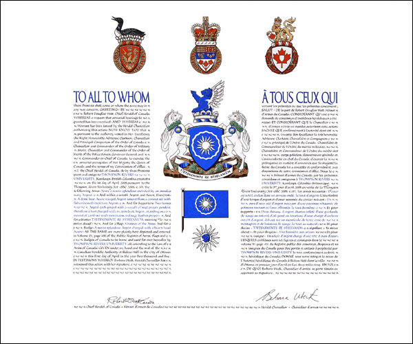 Informations additionnellesCréateur(s)Concept original de Robert D. Watt, Héraut d'armes du Canada, assisté par les hérauts de l'Autorite héraldique du Canada Artiste-peintreLinda Nicholson CalligrapheShirley Mangione Type de récipiendaireInstitution civile