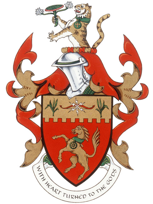 DeviseBlasonWITH HEART TURNED TO THE GODS; SymbolismeCette sentence anglaise signifie « Avec le cœur tourné vers les dieux ». |