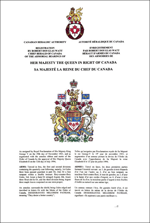 Enregistrement des armoiries et des supports de Sa Majesté la Reine du chef du Canada