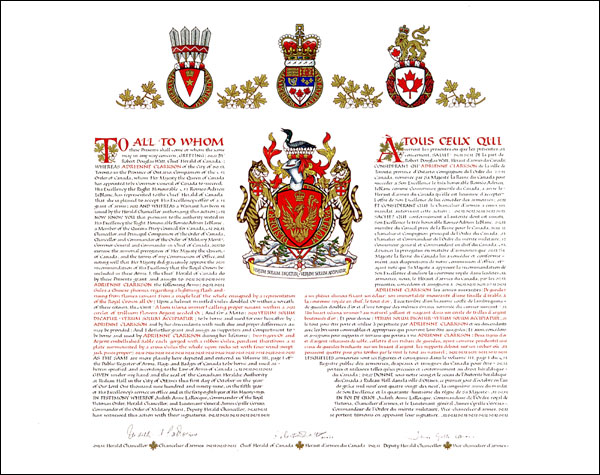Informations additionnellesCréateur(s)Concept original de Robert D. Watt, Héraut d'armes du Canada, assisté par les hérauts de l'Autorité héraldique du Canada Artiste-peintreCathy Bursey-Sabourin / Debra MacGarvie CalligrapheSuzzann Wright Type de récipiendaireIndividuel Statut spécialGouverneur général |