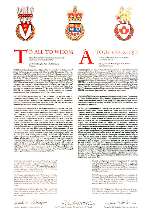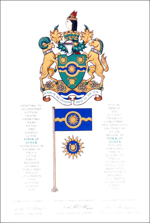 Armoiries du Town of OliverBlasonDe sinople à une fasce nouée d'or, chargée d'une burèle ondée-nouée d'azur et surchargée d'un soleil d'or, le tout accompagné en chef de deux pommes chacune à l'intérieur d'un fer à cheval la pince en haut et en pointe d'une pomme brochante sur un fer à marquer et un pic de mineur passés en sautoir, le tout d'or; SymbolismeLes éléments au centre des armes illustrent la géographie et l’histoire de la ville d’Oliver. Le vert représente les terres restaurées à la vie grâce à l’eau apportée par le South Okanagan Irrigation Project. La bande ondulée bleue symbolise le canal qui traverse les terres arides. Le soleil représente un autre élément essentiel à la croissance et la qualité de vie à Oliver. La pomme et le fer à cheval rappellent un ancien emblème de la ville et honorent les premiers vergers et les chevaux-vapeur essentiels à l’agriculture et aux transports. Le pic de mineur évoque l’exploitation minière dans les montagnes environnantes, juste avant l’établissement du site actuel de la ville. Le fer à marquer rappelle l’importance économique de l’élevage de bovin dans l’histoire de la ville. |