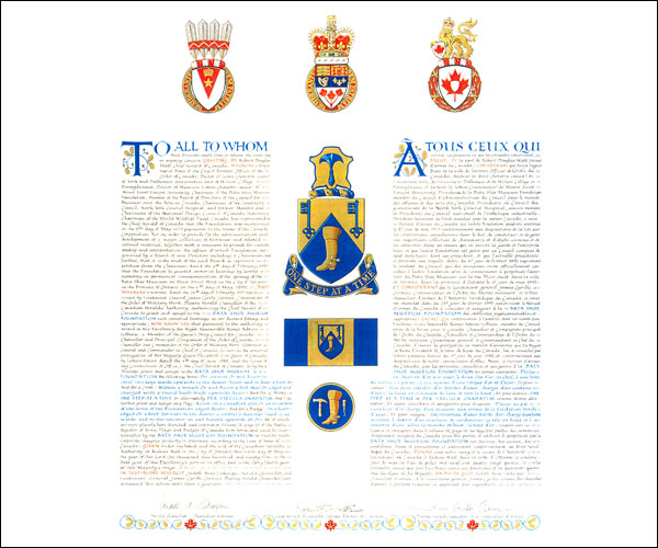 Informations additionnellesCréateur(s)Concept original de Robert D. Watt, héraut d'armes du Canada, assisté par les hérauts de l'Autorité héraldique du Canada Artiste-peintreLinda Nicholson CalligrapheJudith Bainbridge Type de récipiendaireInstitution civile