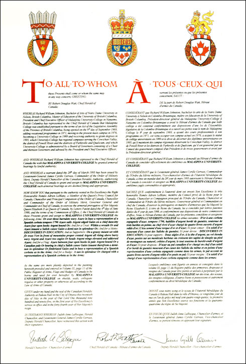 Armoiries du Malaspina University-CollegeBlasonD'or à une corbeta espagnole d'azur, tempore 1790, habillée d'argent bordée de gueules, soutenue de trois burèles ondées en pointe, au chef vivré d'azur chargé de quatre livres ouverts d'argent reliés d'or; SymbolismeLe voilier espagnol de la fin du 18e siècle rappelle le voyage du capitaine Alejandro Malaspina dans la région de l’île de Vancouver en 1791, à la recherche du passage du Nord-Ouest. Cette référence à Malaspina par le vaisseau évoque le nom de l’institution académique du même nom et honore la tradition d’exploration. La ligne dentée du haut représente la chaîne de montagne qui traverse le détroit de Georgia, telle que vue du campus principal. L’apprentissage dynamique est illustré par les livres ouverts et souligne un élément-clé de la mission du University-College. La reliure en or symbolise les bienfaits de l’éducation et la richesse du savoir. Les quatre livres désignent le campus principal et les trois campus régionaux du Malaspina University-College. |