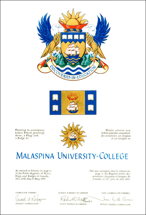 DeviseBlasonDISCOVERIES IN EDUCATION; SymbolismeSignifiant « Des découvertes en éducation », cette devise fut adoptée par Malaspina University-College lors de son inauguration en 1969. Elle renvoie à l’un des navires du capitaine Alejandro Malaspina, le Descubierta, un mot signifiant « découverte ». |