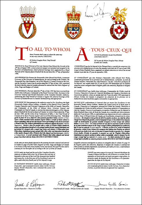 SupportsBlasonÀ dextre, un lion d'or, armé et lampassé de gueules, colleté d'une ceinture de wampum des Autochtones des Prairies au naturel d'où pend une étoile à six rais et à facettes d'argent bordée et garnie d'or, chargée d'une feuille d'érable de gueules; à senestre un cerf de Virginie (Odocoileus virginianus) au naturel portant le même collier et pendentif, celui-ci chargé d'un lis rouge orangé tigé au naturel; les supports debout sur un listel entrelacé de lis rouge orangé tigés et feuillés au naturel, portant la devise; SymbolismeLe lion évoque à nouveau le souverain et le cerf de Virginie, emblème animalier provincial, désigne la Saskatchewan. Ils portent chacun un collier de broderie perlée des Autochtones des Prairies, en hommage aux Premières Nations qui habitent la province. Les pendentifs en étoile que portent les supports évoquent l’étoile de l’Ordre du mérite de la Saskatchewan. La feuille d’érable suspendue au collier du lion représente le Canada et le lis rouge orangé que porte le cerf symbolise la Saskatchewan. Les lis rouge orangé aux pieds du lion et du cerf désignent la province. |