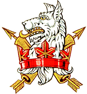 CimierBlasonUn loup d'argent, armé et lampassé d'or, naissant d'une couronne érablée de gueules, ses feuilles aux nervures d'or, tenant de sa patte dextre un parchemin d'or enroulé autour d'une flèche du même; |