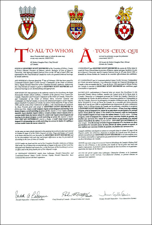 Informations additionnellesCréateur(s)Concept original de Geoffrey Heinricks et de Robert D. Watt, héraut d'armes du Canada, assistés par les hérauts de l'Autorité héraldique du Canada Artiste-peintreGordon Macpherson CalligrapheJudith Bainbridge Type de récipiendaireIndividuel |