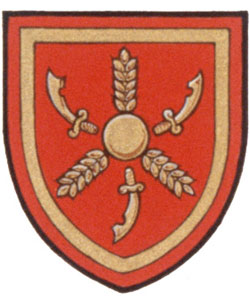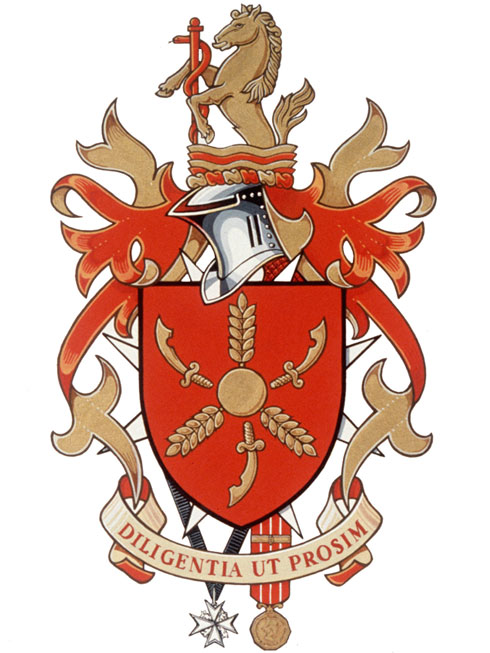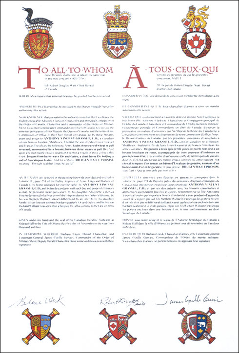 Armoiries d'Anthony Vincent GrassetBlasonDe gueules à trois épis de blé posés en pairle renversé à un besant brochant en coeur, accompagnés de trois couteaux d'ardoisier en pairle, le tout d'or; SymbolismeLe rouge et l'or proviennent des armoiries du Middlesex où le Dr Grasset est né et c'est aussi à l'hôpital du même nom qu'il a reçu sa formation. On retrouve les trois mêmes couteaux dans les armes du Middlesex, mais disposés différemment. Les épis rappellent Les Trois Épis, ferme qu'exploitait l'arrière-grand-père du Dr Grasset en Haute-Alsace. Le disque doré provient des armoiries de la Cornouailles et honore les origines corniques du Dr Grasset. Il convient aussi pour représenter une pilule efficace que le Dr Grasset ne manquait pas de prescrire à ses patients. L'écu est placé sur une croix de Malte à huit pointes, insigne de l'Ordre de Saint-Jean. Sous l'écu, sont suspendus l'insigne d'un chevalier de grâce de l'Ordre très vénérable de l'Hôpital de Saint-Jean de Jérusalem et la Décoration des Forces canadiennes (C.D.) munie d'une barrette. Le Dr Grasset a été par la suite promu chevalier de justice de l'Ordre de Saint-Jean. |