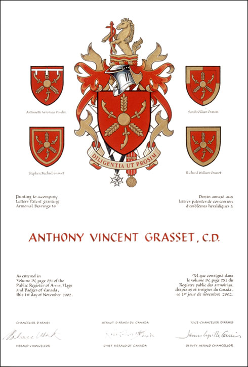 Concession d'armoiries, avec brisures à Antoinette Veronica Posehn, à Stephen Michael Grasset, à Sarah Gillian Grasset et à Richard William Grasset