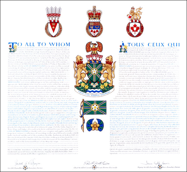 Concession d’armoiries, de supports, d’un drapeau et d’un insigne