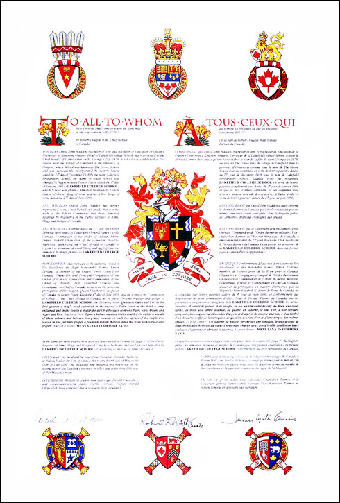 Armoiries de la Lakefield College SchoolBlasonÉcartelé de gueules et de sinople, au un, un rencontre de cerf, au deux, une croix latine, au trois, une lampe allumée, au quatre, un tadorne, le tout d'or, à une bordure componée, les compons burelés-ondés d'argent et d'azur et de sinople alternés; SymbolismeC’est vers 1895 que Mme Mackenzie, épouse du directeur, a choisi le rouge et vert comme couleurs de l’école. Les partisans de l’école arboraient des rubans de ces couleurs lors de rencontres sportives. La tête de cerf provient des armes du chef du clan Mackenzie et honore ainsi le second directeur de Lakefield, le révérend A.W. Mackenzie D.Th. La croix symbolise la foi chrétienne, un élément clé pour les premiers directeurs M. Sparham Sheldrake et le révérend Mackenzie. La lampe, symbole du savoir, représente l’acquisition de connaissances et est traditionnellement associée à des institutions académiques. Le tadorne (sheldrake en anglais) glorifie la mémoire de M. Sheldrake, fondateur de Lakefield en 1879. La bordure de champs verts et de rayures ondulées, symbolisant l’eau, représente visuellement le mot Lakefield (formé des mots anglais pour « lac » et « champ »). |
