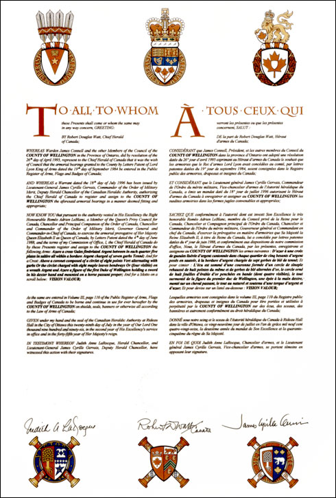 Armoiries du County of WellingtonBlasonD'azur à une croix de gueules lisérée d'argent cantonnée dans chaque quartier de cinq besants d'argent posés en sautoir, à la bordure d'argent chargée de sept gerbes de blé de tenné; |