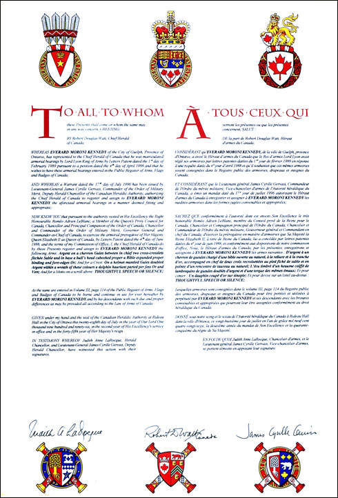 Informations additionnellesCréateur(s)Concept original de Sir James Monteith Grant, roi d'armes Lord Lyon, et de Darrel Kennedy. Artiste-peintreSans objet CalligrapheSans objet Type de récipiendaireIndividuel Autres renseignementsLes emblèmes du récipiendaire ont été précédemment consignés dans les archives de la Cour du Roi d’armes Lord Lyon, Édinbourg, Écosse, le 1 février 1989. Les emblèmes du récipiendaire ont été subséquemment consignés au nom de son fils, Douglas Wayne Kennedy, dans le Registre public des armoiries, drapeaux et insignes du Canada, volume V, page 23, le 20 avril 2006. |