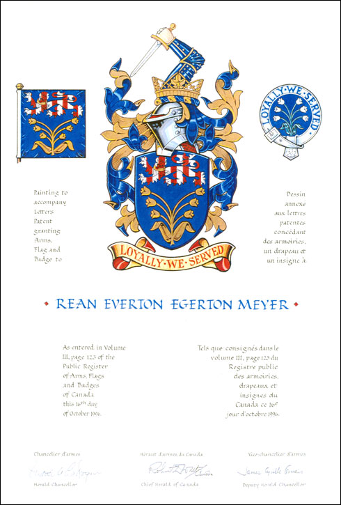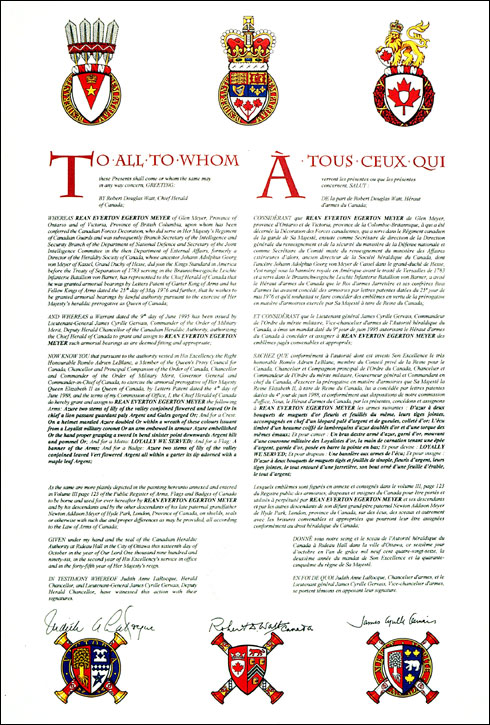 Informations additionnellesCréateur(s)Concept original de Rean Everton Egerton Meyer, assisté par les hérauts de l'Autorité héraldique du Canada. Artiste-peintreGordon Macpherson CalligrapheJudith Bainbridge Type de récipiendaireIndividuel |