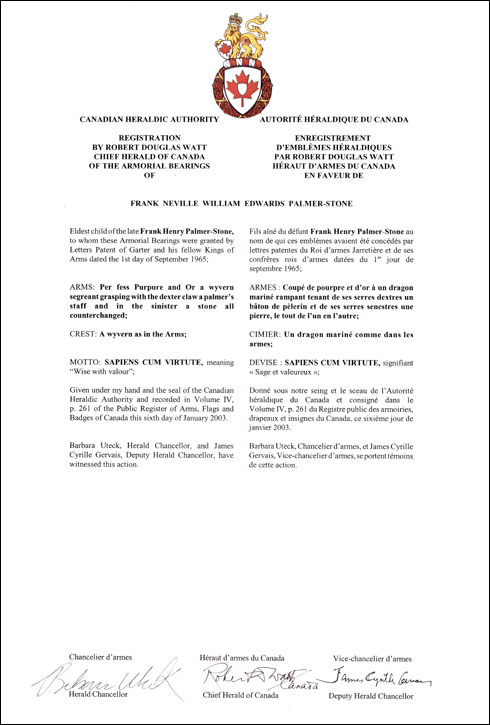 L'utilisation du contenu du Registre public est réservée à des fins de recherche uniquement. Les emblèmes héraldiques du Registre ne peuvent être reproduits sous aucune forme ou par quelque procédé que ce soit sans l'autorisation écrite de l'Autorité héraldique du Canada et/ou du récipiendaire.