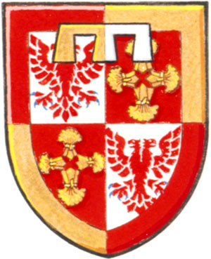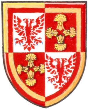 Armoiries de Hugh Mathieson DunlopBlasonÉcartelé, au premier et quatrième d'argent à l'aigle bicéphale de gueules armée d'azur, au deuxième et troisième de gueules à quatre gerbes de blé d'or leurs pieds aboutés formant une croix vidée en cœur, le tout entouré d'une bordure écartelée de gueules et d'or; |