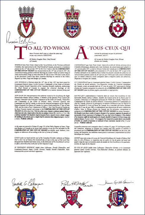 Armoiries de la Corporation of the City of NelsonBlasonDe sinople à une fasce ondée d'argent chargée d'un saumon nageant de gueules et surmontée d'une couronne à l'antique d'or, au chef vivré d'argent; |