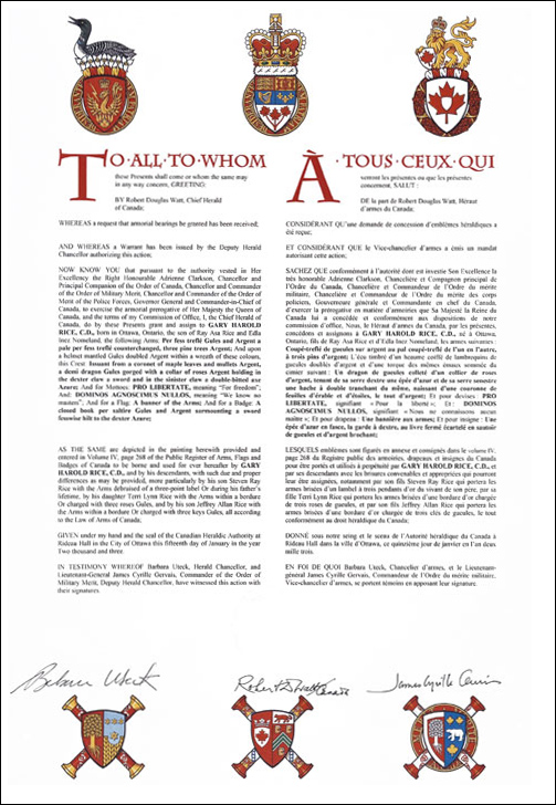 Concession d'armoiries, d'un drapeau et d'un insigne, avec brisures à Steven Ray Rice, à Terri Lynn Rice et à Jeffrey Allan Rice