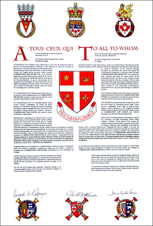 Armoiries de L'Association des Savoie Inc.BlasonDe gueules à la croix d'argent cantonnée au canton dextre du chef de l'étoile de l'Acadie, au canton senestre du chef d'une charrue ancienne, au canton dextre de la pointe d'une fleur de topinambour (Helianthus tuberus) tigée et feuillée, et au canton senestre de la pointe d'une fleur de lis, le tout d'or; SymbolismeLa couleur rouge et la croix blanche sont tirées des armoiries de la Savoie, cédée à la France par le traité de Turin, en 1860. L’étoile jaune rappelle les origines acadiennes de la famille Savoie et la fleur de lis reconnaît les ancêtres français de ses membres. La charrue représente le métier de laboureur qu’exerçait François Savoie, le premier ancêtre en Acadie. La fleur de topinambour illustre la rencontre de l’Ancien Monde avec le Nouveau, et l’adaptation des colons pionniers à leur nouvel environnement. |