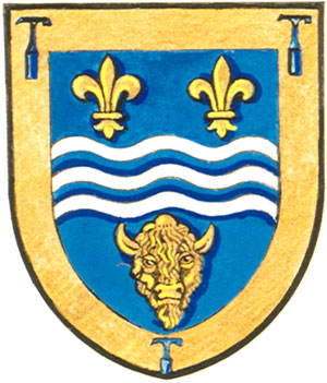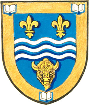 Armoiries de Denis Aldéric St-OngeBlasonD'azur à une tierce ondée d'argent accompagnée en chef de deux fleurs de lis d'or et en pointe d'un rencontre de bison du même; |