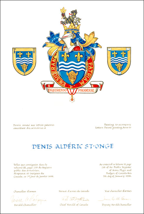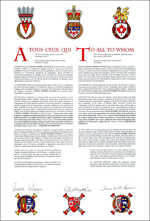Concession d’armoiries, avec brisures à Marc Robert St-Onge et à Nicole Marie St-Onge