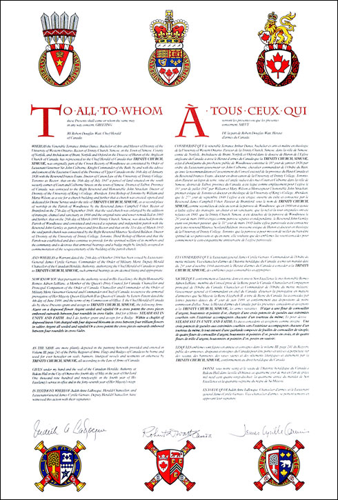 Informations additionnellesCréateur(s)Concept original de David Bowyer, assisté par les hérauts de l'Autorité héraldique du Canada. Artiste-peintreDavid Bowyer CalligrapheDavid Bowyer Type de récipiendaireInstitution civile