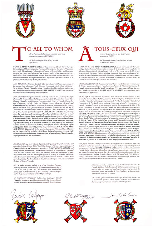 Concession d’armoiries, d’un drapeau et d’un insigne, avec brisures à Brian Patrick Gabriel