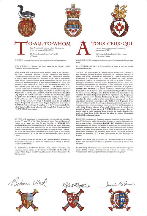 Concession d'armoiries et d'un insigne, avec brisures à Andrew Ian MacDonald et à David James MacDonald