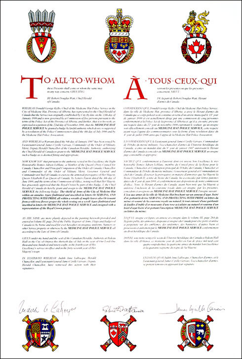 Insigne du Medicine Hat Police ServiceBlasonL'écu aux armes de la ville de Medicine Hat brochant sur un anneau d'azur, liséré d'or, portant la devise SERVING AND PROTECTING WITH PRIDE en lettres du même et sommé de la couronne royale au naturel, le tout entouré d'une guirlande de feuilles d'érable d'or mouvante d'une rose aciculaire au naturel et soutenu d'un listel d'azur liséré d'or portant l'inscription MEDICINE HAT POLICE SERVICE en lettres du même; |