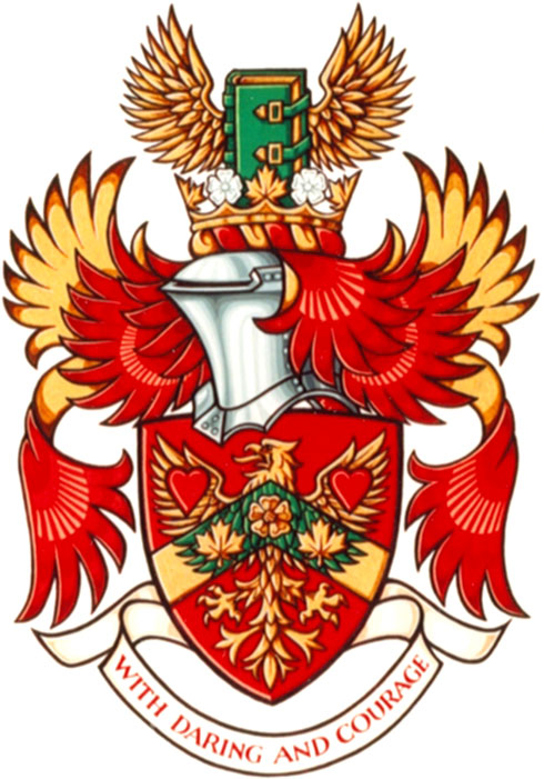 DeviseBlasonWITH DARING AND COURAGE, signifiant « Avec audace et courage »; |