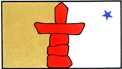 Drapeau du Territoire du NunavutBlasonParti d'or et d'argent à un inuksuk de gueules brochant sur le parti accompagné au canton senestre du chef d'une étoile (niqirtsuituq) d'azur; SymbolismeL’étoile est Niqirsuituq, l'étoile Polaire, repère traditionnel, stable et omniprésent pour les navigateurs, à l’image des aînés dans la collectivité. L’inukshuk, au centre du drapeau, représente les monuments de pierres qui guident les gens sur leur chemin et qui marquent les lieux sacrés et d’autres sites remarquables. Les couleurs bleu et jaune symbolisent la richesse de la terre, de la mer et du ciel. Le rouge représente le Canada. |