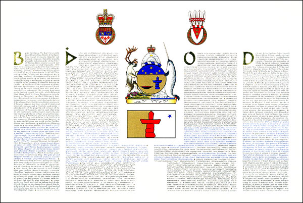 Informations additionnellesCréateur(s)Concept original du comité de symbolisme de la Commision d'établissement du Nunavut, assisté par les hérauts de l’Autorité héraldique du Canada. Artiste-peintreCathy Bursey-Sabourin CalligrapheJudith Bainbridge Type de récipiendaireInstitution civile