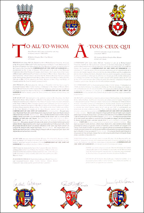 Enregistrement d’armoiries, de supports et d’un insigne, et concession d'un devise