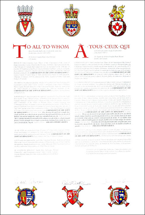 Armoiries de la Corporation of the Town of RidgetownBlasonDivisé en chevron d'or sur sinople à un érable arraché d'or, au chef de sinople chargé d'un livre ouvert d'argent relié d'or accosté à dextre d'un épi de maïs et à senestre d'un anneau crénelé extérieurement du même; |