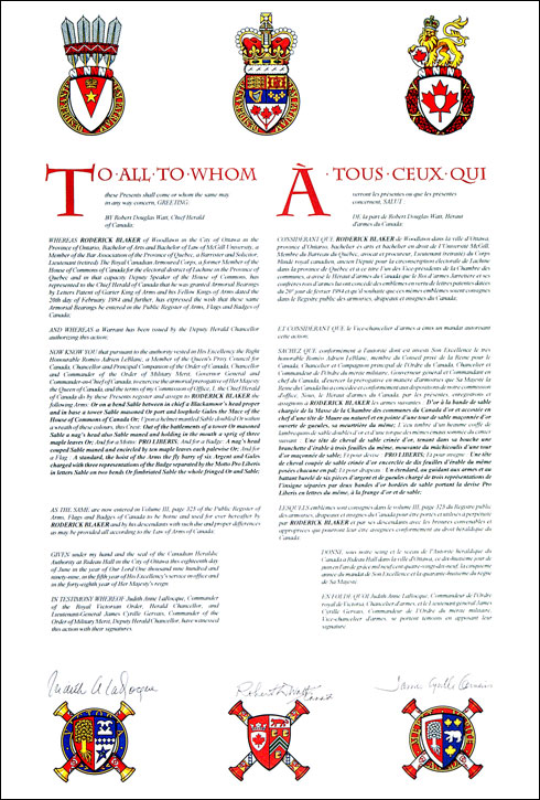Armoiries de Roderick BlakerBlasonD’or à la bande de sable chargée de la Masse de la Chambre des communes du Canada d’or et accostée en chef d’une tête de Maure au naturel et en pointe d’une tour de sable maçonnée d’or ouverte de gueules, sa meurtrière du même; |