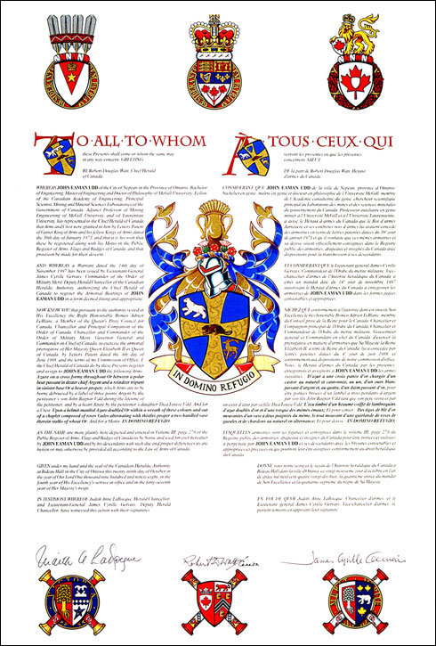 L'utilisation du contenu du Registre public est réservée à des fins de recherche uniquement. Les emblèmes héraldiques du Registre ne peuvent être reproduits sous aucune forme ou par quelque procédé que ce soit sans l'autorisation écrite de l'Autorité héraldique du Canada et/ou du récipiendaire.