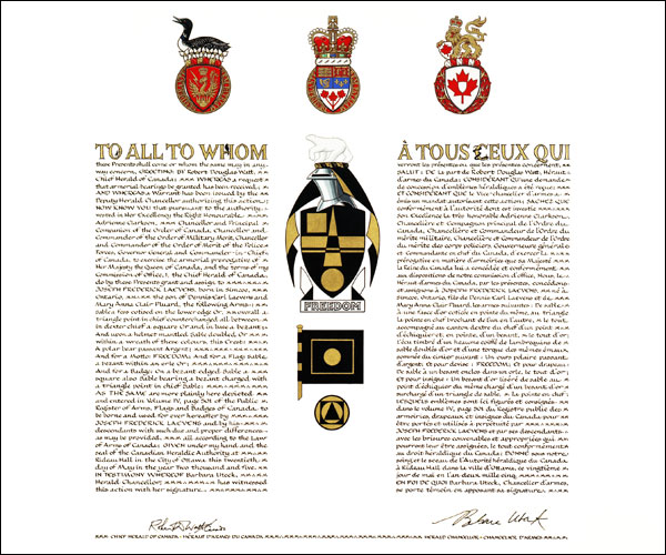 L'utilisation du contenu du Registre public est réservée à des fins de recherche uniquement. Les emblèmes héraldiques du Registre ne peuvent être reproduits sous aucune forme ou par quelque procédé que ce soit sans l'autorisation écrite de l'Autorité héraldique du Canada et/ou du récipiendaire.
