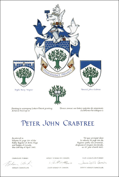 Armoiries de Peter John CrabtreeBlasonD'argent au pommetier fruité arraché de sinople, au chef voûté d'azur maçonné d'argent; SymbolismeLe pommetier (crabtree en anglais) renvoie au nom Crabtree. Le haut de l’écu a l’apparence d’un pont et évoque la carrière d’ingénieur civil de M. Crabtree. Il rappelle aussi le château dans les armes d’Exeter en Angleterre, où il est né. |