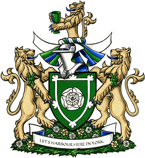 Armoiries de The York ClubBlasonDe sinople à la rose d’argent enclose dans un trescheur érablé, le tout d’argent; SymbolismeLe vert et le blanc sont utilisés pour continuer la longue tradition du Club. Le vert est tiré des armoiries de l’Ontario, une façon de souligner que le Club est situé dans la capitale de la province. La rose blanche était l’insigne de la maison de York en Angleterre à l’époque médiévale, et comme le Club porte ce nom, cette fleur a longtemps été le principal symbole du Club. York était également le nom de la ville de Toronto avant l’incorporation de celle-ci en 1834. Le trescheur rappelle le décor des murs du Club et rend hommage au rôle que la résidence historique Gooderham joue en tant que siège du Club. Les feuilles d’érable reflètent les services que le Club rend au Canada grâce à la contribution d’un grand nombre de ses membres. |