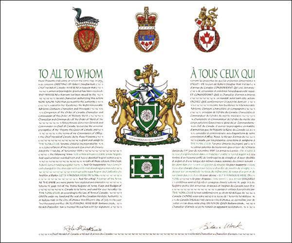 SupportsBlasonDeux lions d’or chargés chacun sur l’épaule d’un fer de moulin de sinople, debout sur un monticule herbeux du même orné de roses d’argent et de narcisses des prés d’or; SymbolismeLes lions symbolisent la force et le pouvoir. La singularité de ces lions vient du fait qu’ils sont ornés du fer de moline, un symbole qui faisait partie des armoiries concédées en 1912 à un membre de la famille Gooderham de Toronto, un important bienfaiteur du Club, et dont la résidence est devenue le siège du Club. L’herbe rappelle les pelouses qui entourent le Club, et les roses font une fois de plus référence au nom et à l’emblème du Club. Les jonquilles représentent les notions de regain de vie et de croissance nouvelle et, par conséquent, la future génération de membres. |