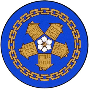 Insigne de la Union of British Columbia MunicipalitiesBlasonUn tourteau d’azur chargé d’une fleur de cornouiller d’argent boutonnée d’or entourée de cinq maisons, leurs bases jointes en abîme, encloses dans un cercle de chaîne, le tout d’or; SymbolismeLe symbolisme de cet emblème est compris dans un ou plusieurs éléments de ce dossier. |