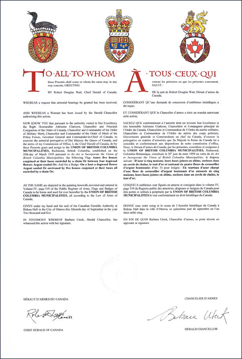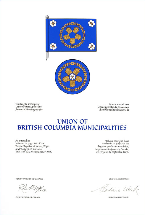 Drapeau de la Union of British Columbia MunicipalitiesBlasonD’azur à cinq maisons, leurs bases jointes en abîme, encloses dans un cercle de chaîne, le tout d’or et cantonné de quatre fleurs de cornouiller d’argent boutonnées d’or; SymbolismeLe bleu représente l’océan, les rivières, les lacs et les montagnes de la Colombie-Britannique. Le doré symbolise la richesse des communautés. Les façades des maisons évoquent les cinq divisions de l’Union. La chaîne représente la force des communautés qui, grâce à cette organisation, agissent ensemble en faveur du bien commun. Les fleurs de cornouiller symbolisent l’envergure provinciale de l’Union. |