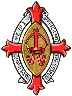 Insigne de la faculté de théologie de The Huron University College CorporationBlasonUne vesica piscis d’or chargée d’une mitre du même, aux orfrois et aux fanons de gueules, brochante sur une croix enhendée du même et environnée d’un listel d’argent inscrit WOE IS UNTO ME IF I PREACH NOT THE GOSPEL en lettres de sable; SymbolismeL'insigne s’inspire du sceau original du collège, constitué d’une mitre sur une vesica piscis, le tout entouré de la devise. La croix prend la forme de celle qui surmonte le clocher de la chapelle du collège. Le rouge fait référence à la théologie. Le ruban porte la devise qu’utilise le séminaire depuis 1873. |