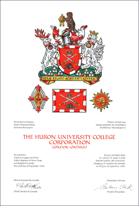 SupportsBlasonÀ dextre un cerf d’hermine, ramé, onglé et colleté d’un collier, le tout de gueules, d’où pend un tourteau de pourpre chargé d’un croissant d’or, à senestre un lion à double queue d’hermine, armé et lampassé de gueules, ceint d’une couronne ducale d’or, colleté d’un collier de gueules d’où pend un tourteau de pourpre chargé d’une étoile flamboyante à douze rais d’or, debout sur un mont herbeux de sinople semé de fleurs de trille au naturel; SymbolismeLes rondelles au cou des deux supports sont aux couleurs du collège. Le cerf, au pelage d’hermine pour l’équilibre, rappelle, avec sa rondelle à motif de croissant, les armoiries utilisées par l’évêque Benjamin Cronyn, fondateur du collège. Ce cerf évoque également la University of Western Ontario, car cette figure est présente dans les armoiries de cette institution dont Huron fut le collège fondateur. Le lion à double queue au pelage d’hermine fait référence au révérend père Alfred Peache, qui a fourni les fonds nécessaires à l’établissement du Collège Huron. Le lion figure également dans les armoiries de la University of Western Ontario. La rondelle au cou du lion montre une étoile à douze branches, reprise des armoiries du lieutenant-gouverneur John Graves Simcoe, et qui rend hommage aux filles de ce dernier, qui ont contribué d’une manière significative au développement du collège. L’étoile est l’étoile polaire, qui sert de guide. Le lion et l’étoile représentent, encore une fois, l’appui continu fourni par le clergé et par la société laïque au cours des 140 années d’existence du collège. Les supports se tiennent sur une terrasse verte parsemée de trilles, emblème floral de l’Ontario. |