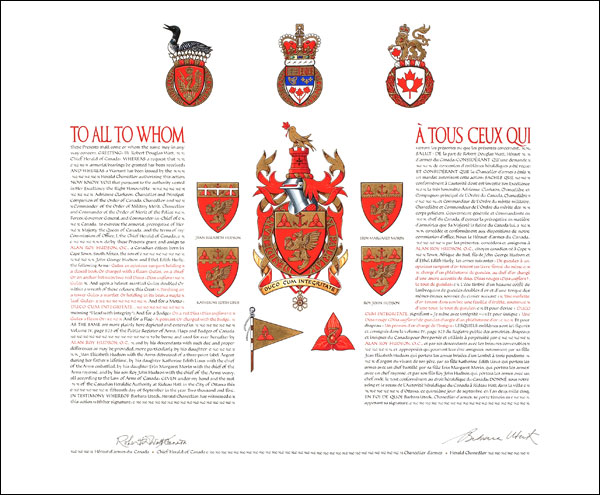 Armoiries d'Alan Roy HudsonBlasonDe gueules à un opinicus rampant d’or tenant un livre fermé du même chargé d’un phlébotome de gueules, au chef d’or chargé d’une ancre accostée de deux Disas rouges (Disa uniflora), le tout de gueules; SymbolismeL’opinicus, utilisé comme symbole de la médecine chirurgicale en héraldique depuis le 16e siècle, révèle la profession de chirurgien du dr Hudson. La lancette, qui en est un autre, est posée sur le livre, reflétant ainsi l’enseignement et la recherche, deux volets du travail du dr Hudson en tant que professeur à la faculté de médecine de l’université de Toronto et auteur de nombreux articles liés à la recherche en neurochirurgie. L’ancre, un ancien symbole de l’espoir, provient des armoiries de Cape Town, sa ville natale, et de celles de son alma mater, l’université de Cape Town où a également étudié son épouse. L’ancre dénote également la passion du dr Hudson pour la voile. La disa rouge, emblème floral de l’ancienne Cape Province et de l’actuelle province sud-africaine du Western Cape, est une fleur qui pousse sur le mont Table. Elle rappelle au dr Hudson les escalades de montagne qu’il a faites dans sa vie. |