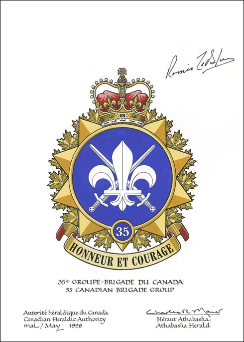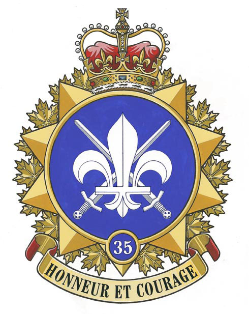 Insigne du 35e Groupe-Brigade du CanadaBlasonD’azur à une fleur de lis d’argent brochante sur deux épées de croisé du même passées en sautoir; SymbolismeLa fleur de lis blanche sur fond bleu symbolise la province de Québec où se trouve le quartier général de la Brigade. Les épées croisées symbolisent le rôle militaire de l’unité. |