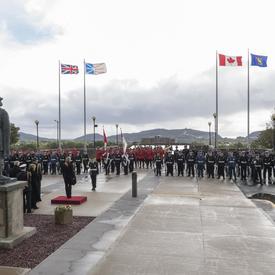 • Son Excellence a passé en revu la garde d'honneur qui était compposée de membres de la 5e Division du Canada, la réserve navale, la réserve aérienne Torbay, la Gendarmerie royale du Canada, le Royal Newfoundland Constabulary et la 5e Groupe de patrouilles
