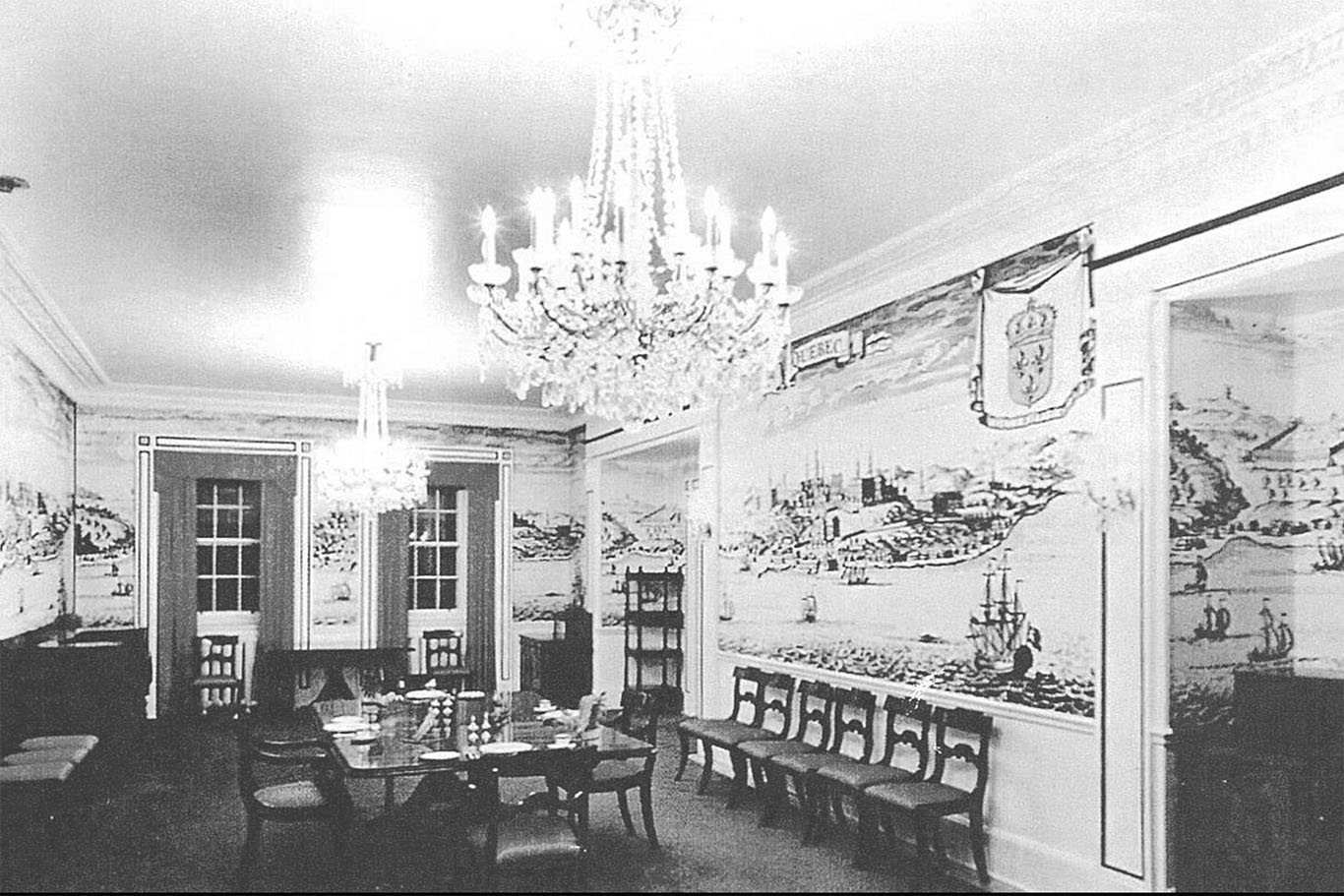 Vers 1960, sous Georges P. Vanier, gouverneur général de 1959 à 1967, on remplace donc le papier peint de la salle à manger pour représenter véritablement la ville de Québec. Le nouveau papier peint serait inspiré d’une gravure intitulée Québec, 1685. À l’époque, le tissu qui recouvre les chaises est rouge vif.